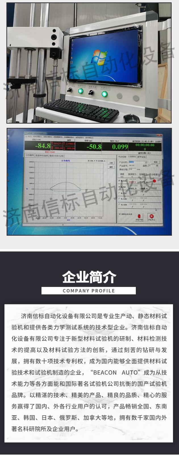 濟南信標自動化設備有限公司主要生產:動靜態萬能疲勞試驗機,接骨板彎曲試驗機,縫合線拉伸疲勞試驗機,髖膝關節磨損試驗機,電子萬能試驗機、液壓萬能試驗機、巖石三軸、四軸,電液拉力試驗機,材料試驗機,高低溫蠕變,高低頻疲勞,拉伸、扭轉、杯突等二十多個系列兩千多個的品種。